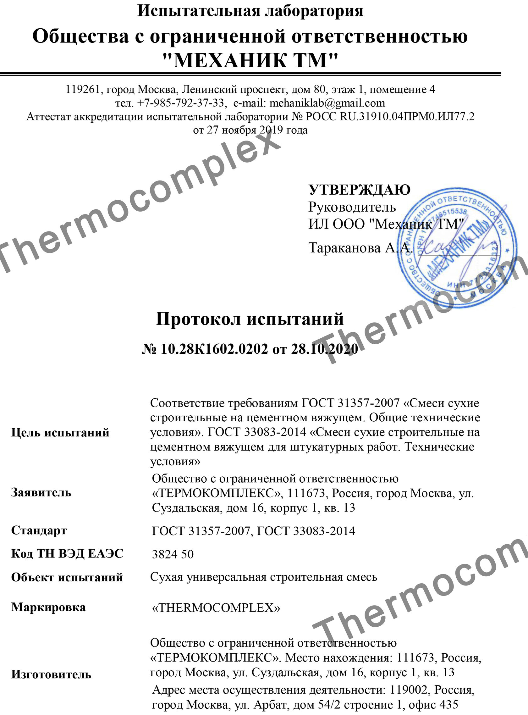 Протокол испытаний продукции Thermocomplex